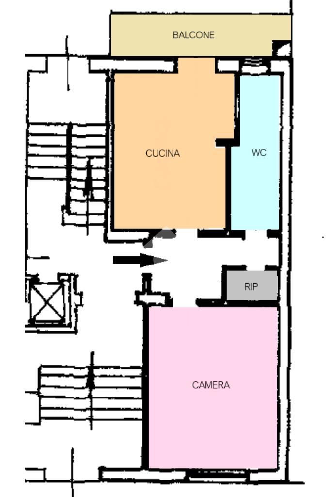 Dal portoncino blindato di ingresso si accede al disimpegno che ben divide gli ambienti della casa: zona giorno living con cucina a vista dotata di spazio sufficiente per un comodo divano, parete TV e tavolo da pranzo con alcune sedie. Qui abbiamo l'affaccio sul balcone lato interno cortile. Sempre per mezzo del disimpegno, si accede alla zona notte composta da una camera matrimoniale, versatile in base alle necessità di arredo. Bagno finestrato dotato di box doccia e di tutti i sanitari utili.