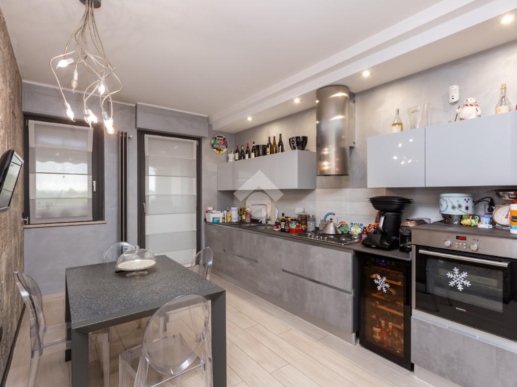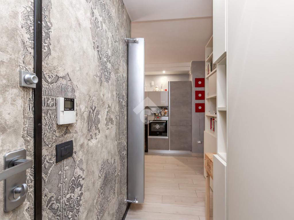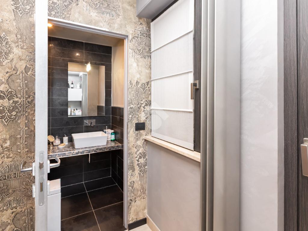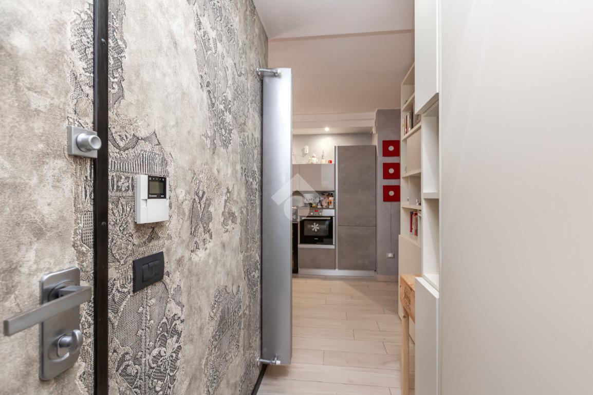 Dal portoncino blindato si accede al disimpegno che ben collega la sala da pranzo con cucina a vista e bagno di servizio, dotata di ampio terrazzo, dal soggiorno in cui troviamo un secondo terrazzino.