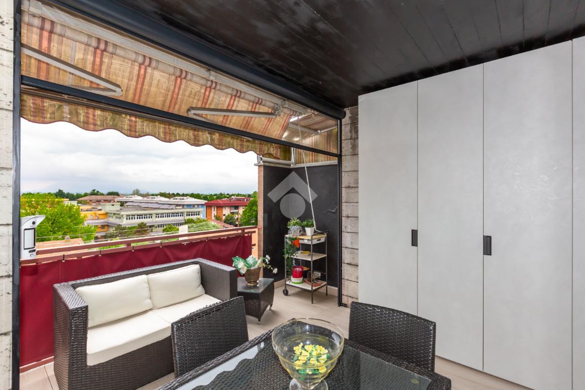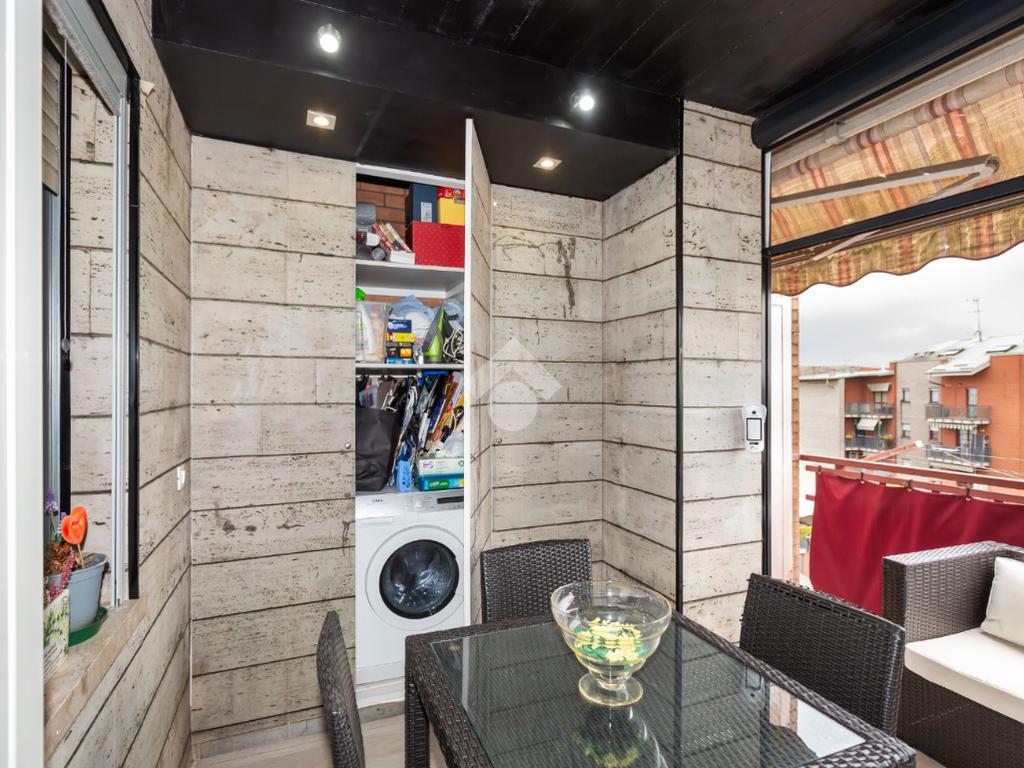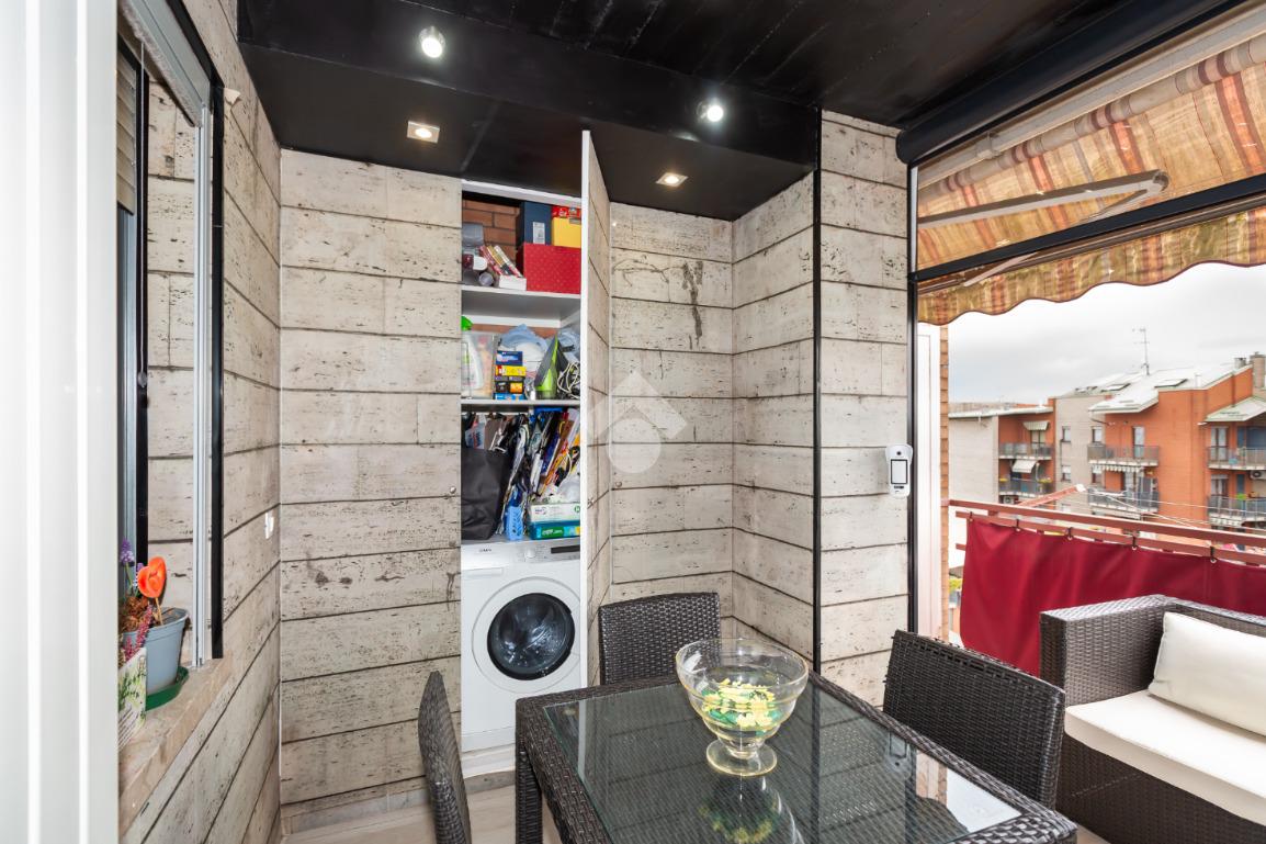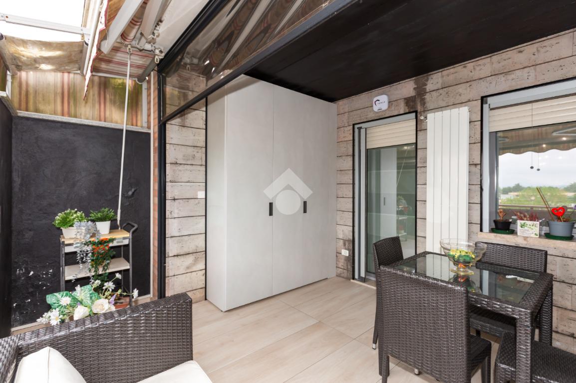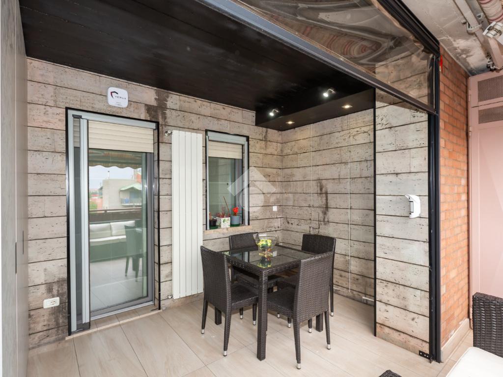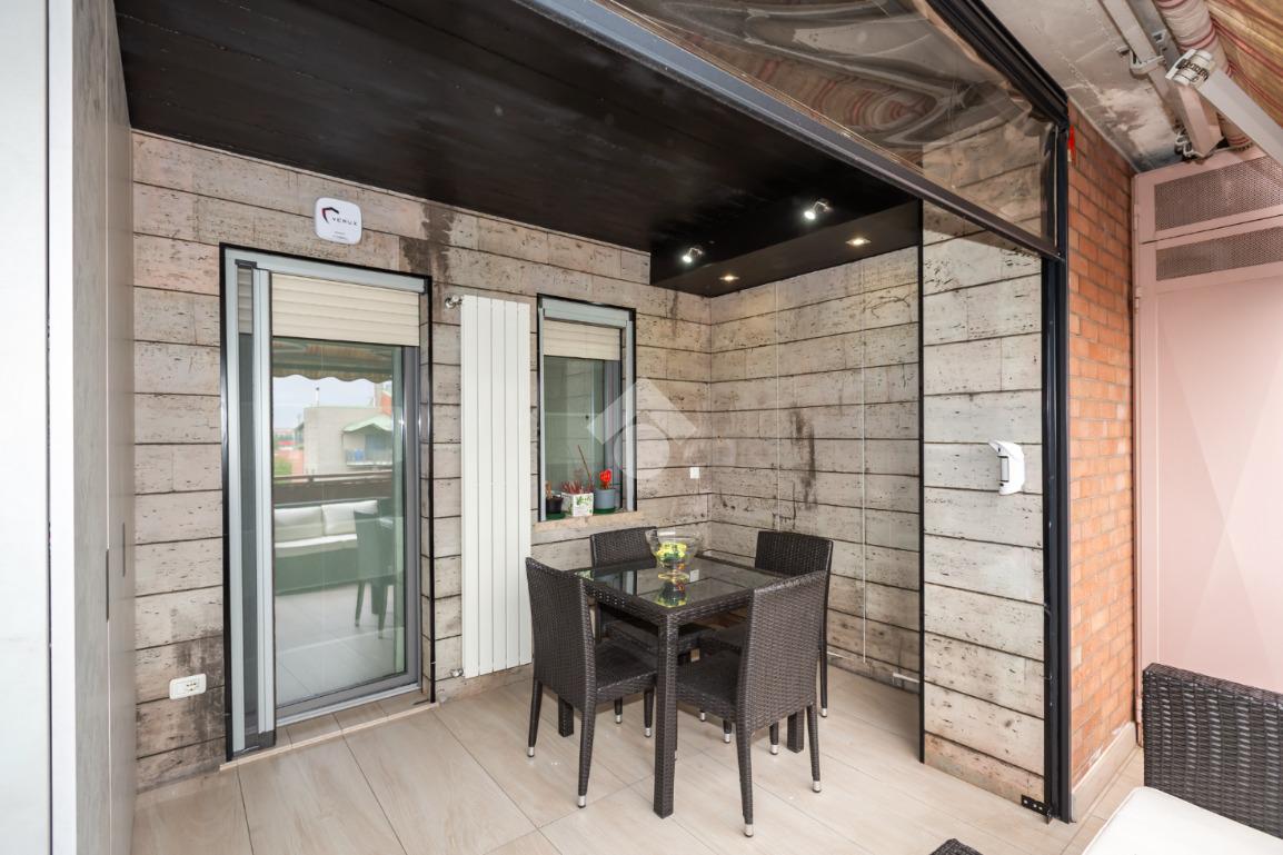 Il terrazzo, ben suddiviso esternamente da una tenda veranda invernale e dotato di termosifone e ripostiglio salva-spazio, offre uno spazio in cui potersi rilassare all'aperto anche nei mesi freddi, garantendo comfort anche nei mesi caldi grazie alle tende estive.