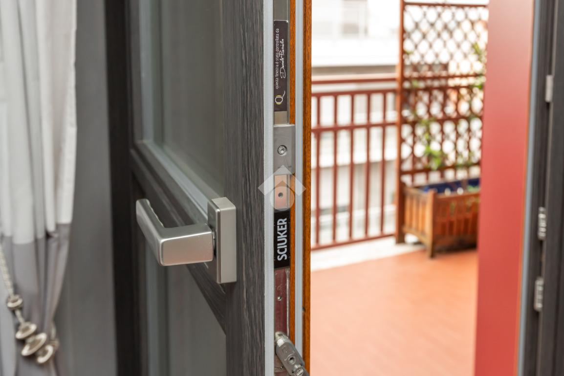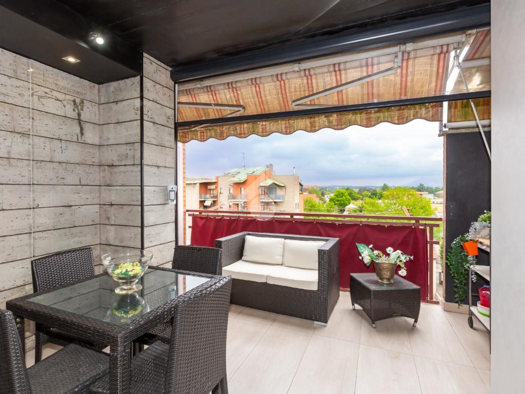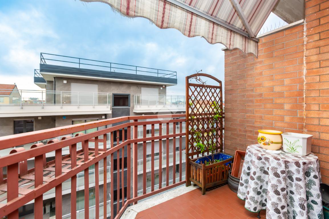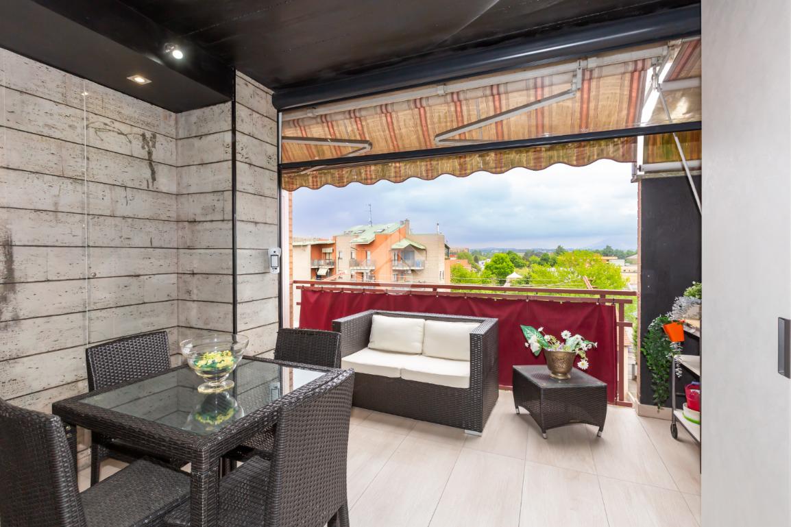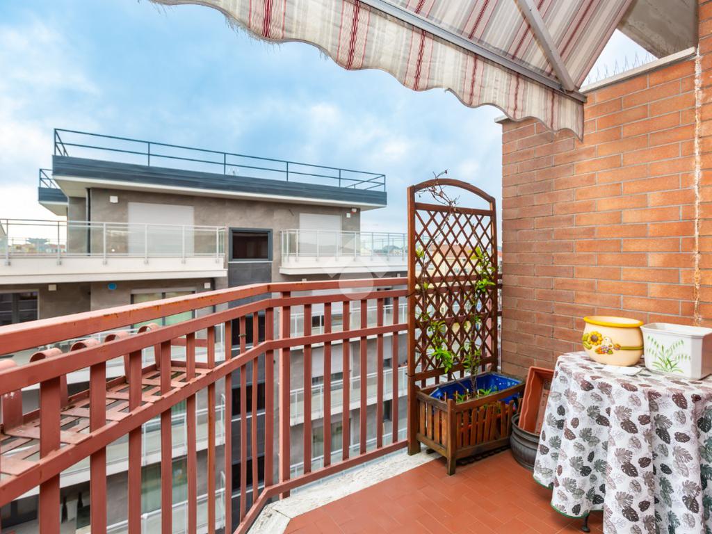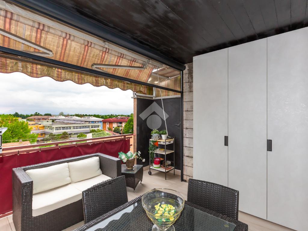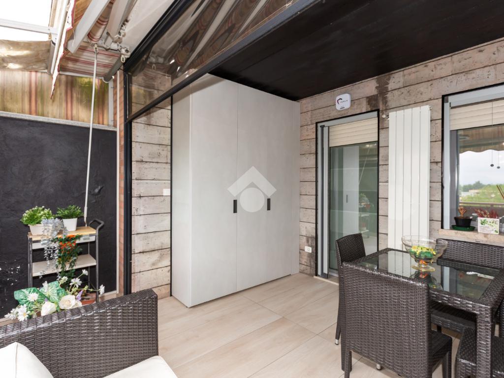 Il terrazzo, ben suddiviso esternamente da una tenda veranda invernale e dotato di termosifone e ripostiglio salva-spazio, offre uno spazio in cui potersi rilassare all'aperto anche nei mesi freddi, garantendo comfort anche nei mesi caldi grazie alle tende estive.